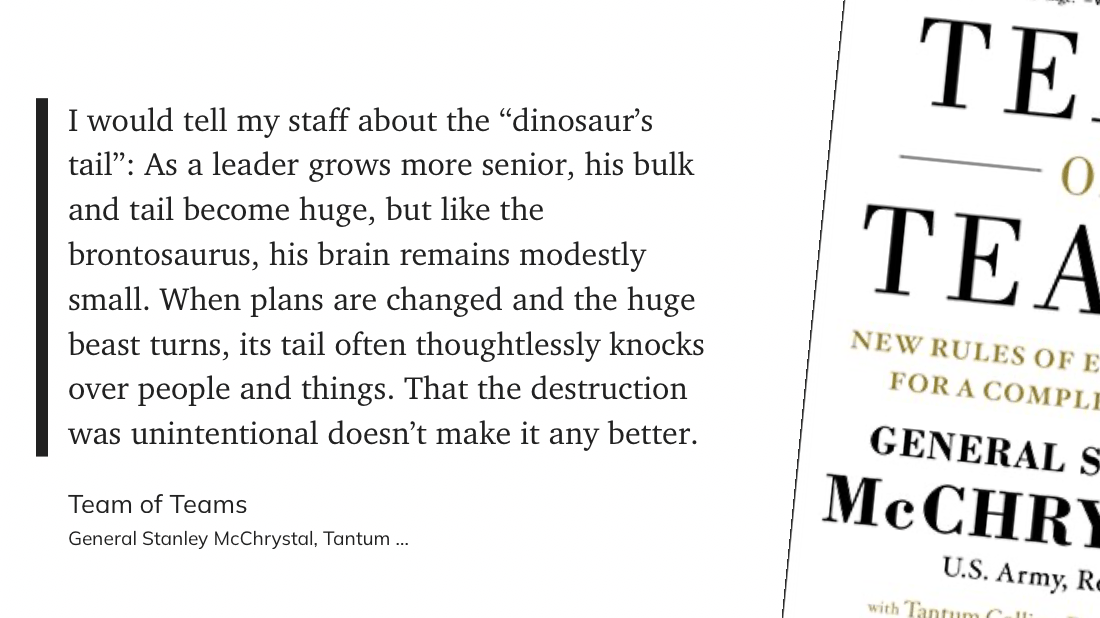 In Team of Teams, General McCrystal talks about the “dinosaur’s tail.”